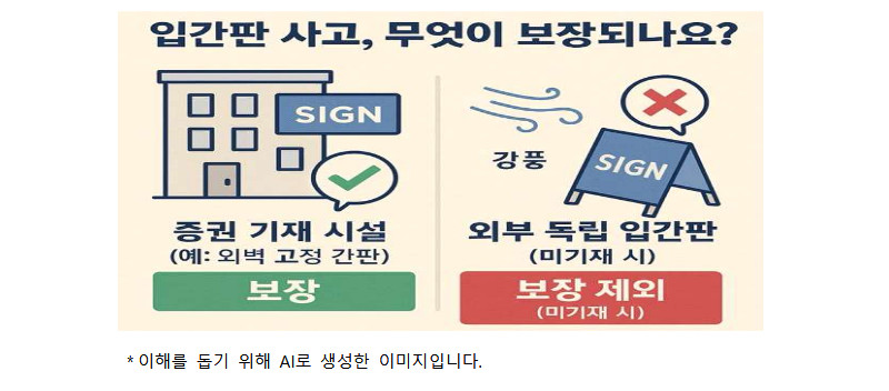 ▣ 입간판 등 외부 독립 설치물을 보장받으려면, 해당 물건을 보험증권의 보험목적물(시설목록)로 포함해서 보험에 가입하셔야 합니다.