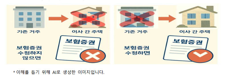 ▣ 다만, 약관에 따라서는 변경 전 보험증권에 기재된 주택에 피보험자가 거주하거나 소유하지 않은 사실이 확인되고, 이사 간 주택의 위험이 현저히 증가하지 않았다면 보상이 될 수도 있으니 확인하시기 바랍니다.